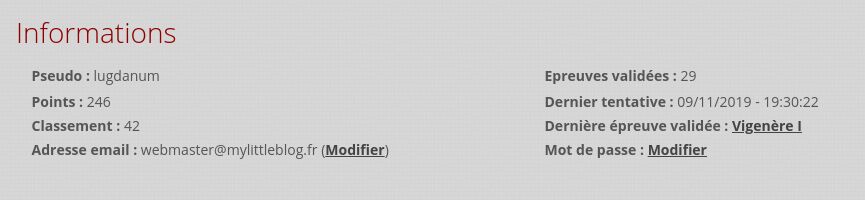 Cela faisait un petit bout de temps que je n'étais pas allé me faire une petite épreuve sur Microcontest et je me suis aperçu que je n'avais pas réalisé l'épreuve 10 Vigenère 1 alors que j'avais fait l'épreuve 11 Vigenère 2 !!