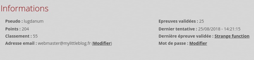 J’ai validé l’épreuve “:: Divers :: Strange function (57)”, bon au début je me suis dit, va falloir que je me tape du C… Pas que je n’ai pas envie, mais je n’ai plus l’âge ni le temps d’apprendre encore un nouveau langage ! Même si j’avoue que j’aurais aimé le maîtriser ! Mais j’aurais dû m’y pencher plus jeune quand j’avais l’esprit plus vivace, maintenant je me tourne vers des “langages plus récents” comme le Python, Go, Kotlin, Haxe… Avec une préférence pour Python, simple et efficace, pourquoi refaire le monde…. !